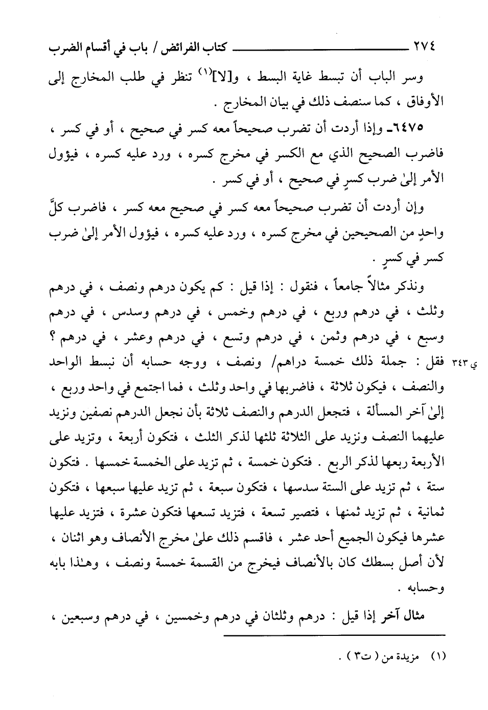 6475 - وإذا أردت أن تضرب صحيحاً معه كسر في صحيح، أو في كسر، فاضرب الصحيح الذي مع الكسر في مخرج كسره، ورد عليه كسره، فيؤول الأمر إلى ضرب كسرٍ في صحيح، أو في كسر. وإن أردت أن تضرب صحيحاً معه كسر في صحيح معه كسر، فاضرب كلَّ واحدٍ من الصحيحين في مخرج كسره، ورد عليه كسره، فيؤول الأمر إلى ضرب كسر في كسرٍ.
