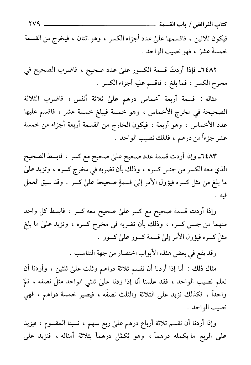 6482 - فإذا أردتَ قسمة الكسور على عدد صحيح، فاضرب الصحيح في مخرج الكسر، فما بلغ، فاقسم عليه أجزاء الكسر.