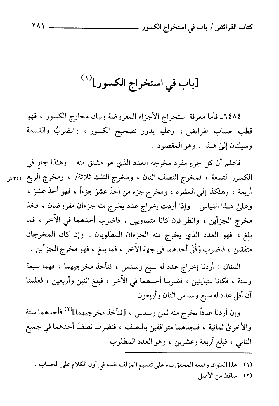 6484 - فأما معرفة استخراج الأجزاء المفروضة وبيان مخارج الكسور، فهو قطب حساب الفرائض، وعليه يدور تصحيح الكسور، والضربُ والقسمة وسيلتان إلى هذا. وهو المقصود.