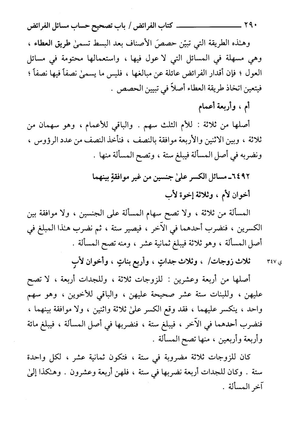 كان للزوجات ثلاثة مضروبة في ستة، فتكون ثمانية عشر، لكل واحدة ستة. وكان للجدات أربعة نضربها في ستة، فلهن أربعة وعشرون. وهكذا إلى آخر المسألة.