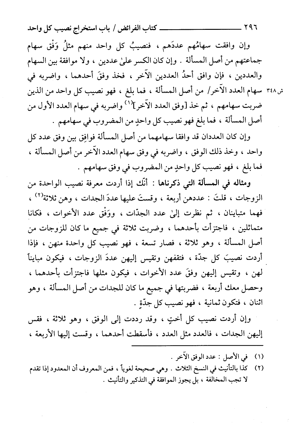 ومثاله في المسألة التي ذكرناها: أنّك إذا أردت معرفة نصيب الواحدة من الزوجات، قلتَ: عددهن أربعة، وقستَ عليها عددَ الجدات، وهن ثلاثة (2)، فهما متباينان، ثم نظرت إلى عدد الجدّات، ووَفْق عدد الأخوات، فكانا متماثلين، فاجتزأت بأحدهما، وضربت ثلاثة في جميع ما كان للزوجات من أصل المسألة، وهو ثلاثة، فصار تسعة، فهو نصيب كل واحدة منهن، فإذا أردت نصيبَ كل جدّة، فتقفهن وتقيس إليهن عددَ الزوجات، فيكون مبايناً لهن، وتقيس إليهن وفقَ عدد الأخوات، فيكون مثلها فاجتزأت بأحدهما، وحصل معك أربعة، فضربتها في جميع ما كان للجدات من أصل المسألة، وهو اثنان، فتكون ثمانية، فهو نصيب كل جدّةٍ.