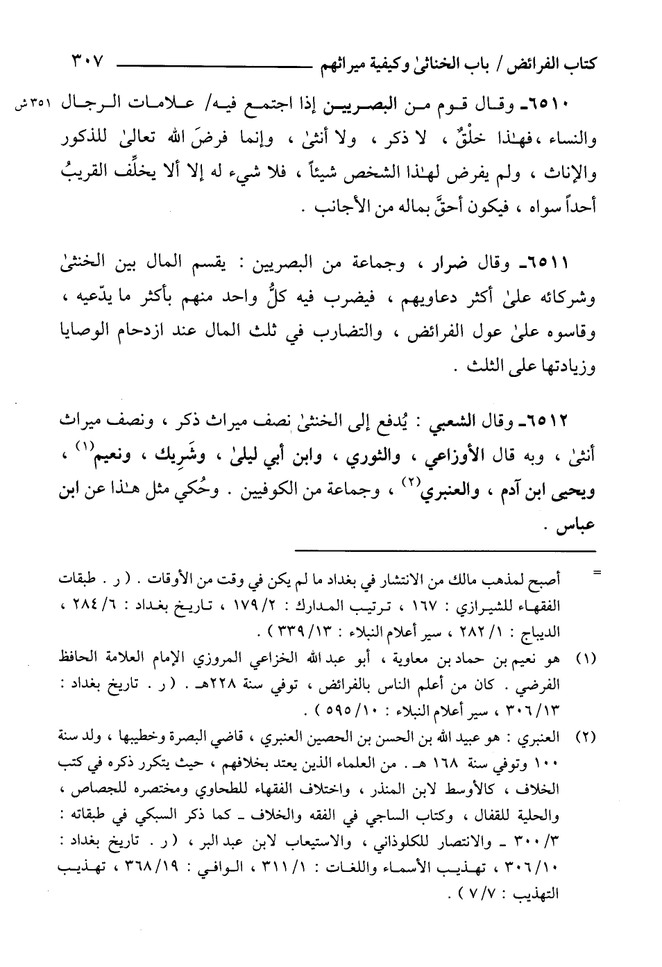 6512 - وقال الشعبي: يُدفع إلى الخنثى نصف ميراث ذكر، ونصف ميراث أنثى، وبه قال الأوزاعي، والثوري، وابن أبي ليلى، وشَرِيك، ونعيم (1)، ويحى ابن آدم، والعنبري (2)، وجماعة من الكوفيين. وحُكي مثل هذا عن ابن عباس.