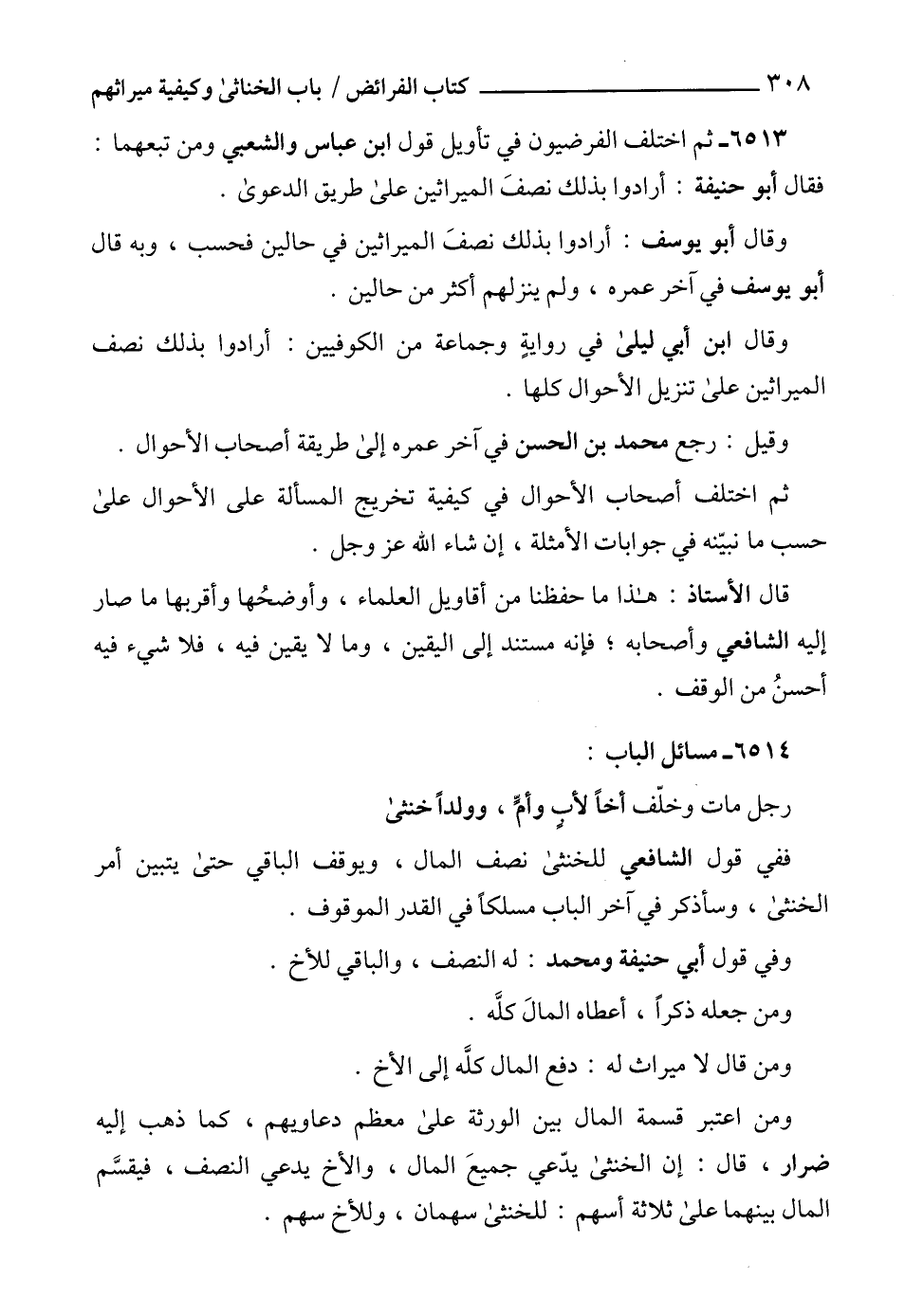 6513 - ثم اختلف الفرضيون في تأويل قول ابن عباس والشعبى ومن تبعهما: فقال أبو حنيفة: أرادوا بذلك نصفَ الميراثين على طريق الدعوى.