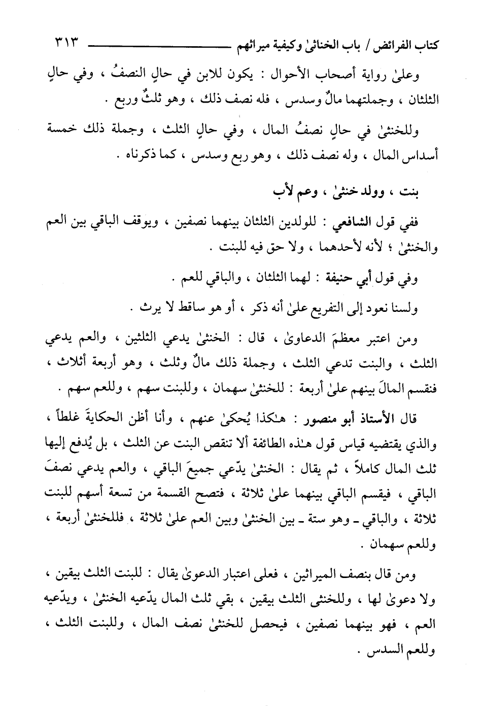 قال الأستاذ أبو منصور: هكذا يُحكى عنهم، وأنا أظن الحكايةَ غلطاً، والذي يقتضيه قياس قول هذه الطائفة ألا تنقص البنت عن الثلث، بل يُدفع إليها ثلث المال كاملاً، ثم يقال: الخنثى يدّعي جميعَ الباقي، والعم يدعي نصفَ الباقي، فيقسم الباقي بينهما على ثلاثة، فتصح القسمة من تسعة أسهم للبنت ثلاثة، والباقي -وهو ستة- بين الخنثى وبين العم على ثلاثة، فللخنثى أربعة، وللعم سهمان.