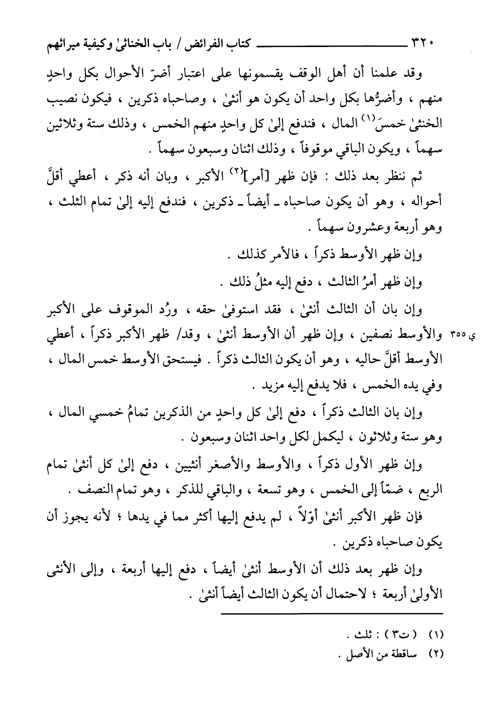 وقد علمنا أن أهل الوقف يقسمونها على اعتبار أضرّ الأحوال بكل واحدٍ منهم، وأضرُّها بكل واحد أن يكون هو أنثى، وصاحباه ذكرين، فيكون نصيب الخنثى خمسَ (1) المال، فندفع إلى كل واحدٍ منهم الخمس، وذلك ستة وثلاثين سهماً، ويكون الباقي موقوفاً، وذلك اثنان وسبعون سهماً.