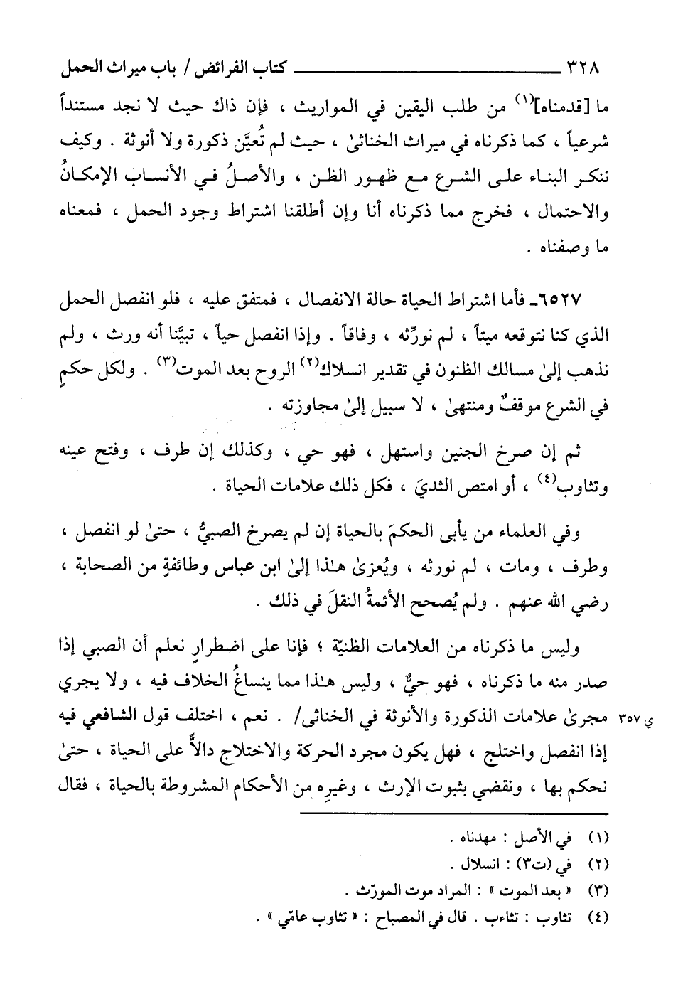 6527 - فأما اشتراط الحياة حالة الانفصال، فمتفق عليه، فلو انفصل الحمل الذي كنا نتوقعه ميتاً، لم نورِّثه، وفاقاً. وإذا انفصل حياً، تبيَّنا أنه ورث، ولم نذهب إلى مسالك الظنون في تقدير انسلاك (2) الروح بعد الموت (3). ولكل حكمٍ في الشرع موقفٌ ومنتهى، لا سبيل إلى مجاوزته.