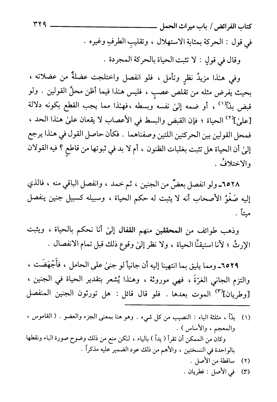 وفي هذا مزيدُ نظرٍ وتأمل، فلو انفصل واختلجت عضلةٌ من عضلاته، بحيث يفرض مثله من تقلص عصبٍ، فليس هذا فيما أظن محلَّ القولين. ولو قبض بدّاً (1)، أو ضمه إلى نفسه وبسطه، فهذا مما يجب القطع بكونه دلالة [على] (2) الحياة؛ فإن القبض والبسط في الأعصاب لا يقعان على هذا الحد، فمحل القولين بين الحركتين اللتين وصفناهما. فكأن حاصل القول في هذا يرجع إلى أن الحياة هل تثبت بغلبات الظنون، أم لا بد في ثبوتها من قاطعٍ؟ فيه القولان والاختلافُ.