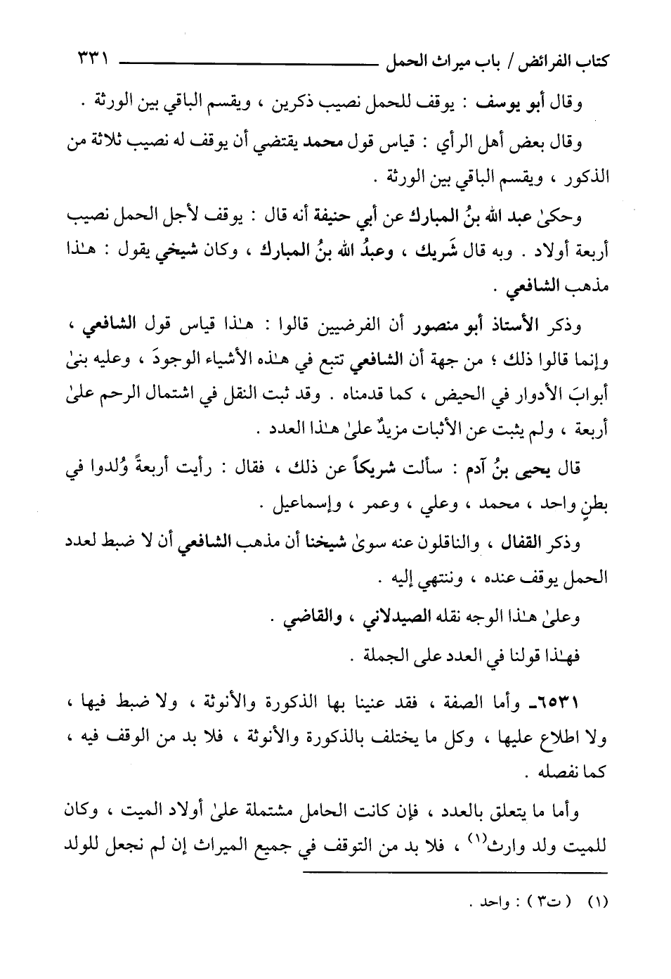 وذكر الأستاذ أبو منصور أن الفرضيين قالوا: هذا قياس قول الشافعي، وإنما قالوا ذلك؛ من جهة أن الشافعي تتبع في هذه الأشياء الوجودَ، وعليه بنى أبوابَ الأدوار في الحيض، كما قدمناه. وقد ثبت النقل في اشتمال الرحم على أربعة، ولم يثبت عن الأثبات مزيدٌ على هذا العدد.