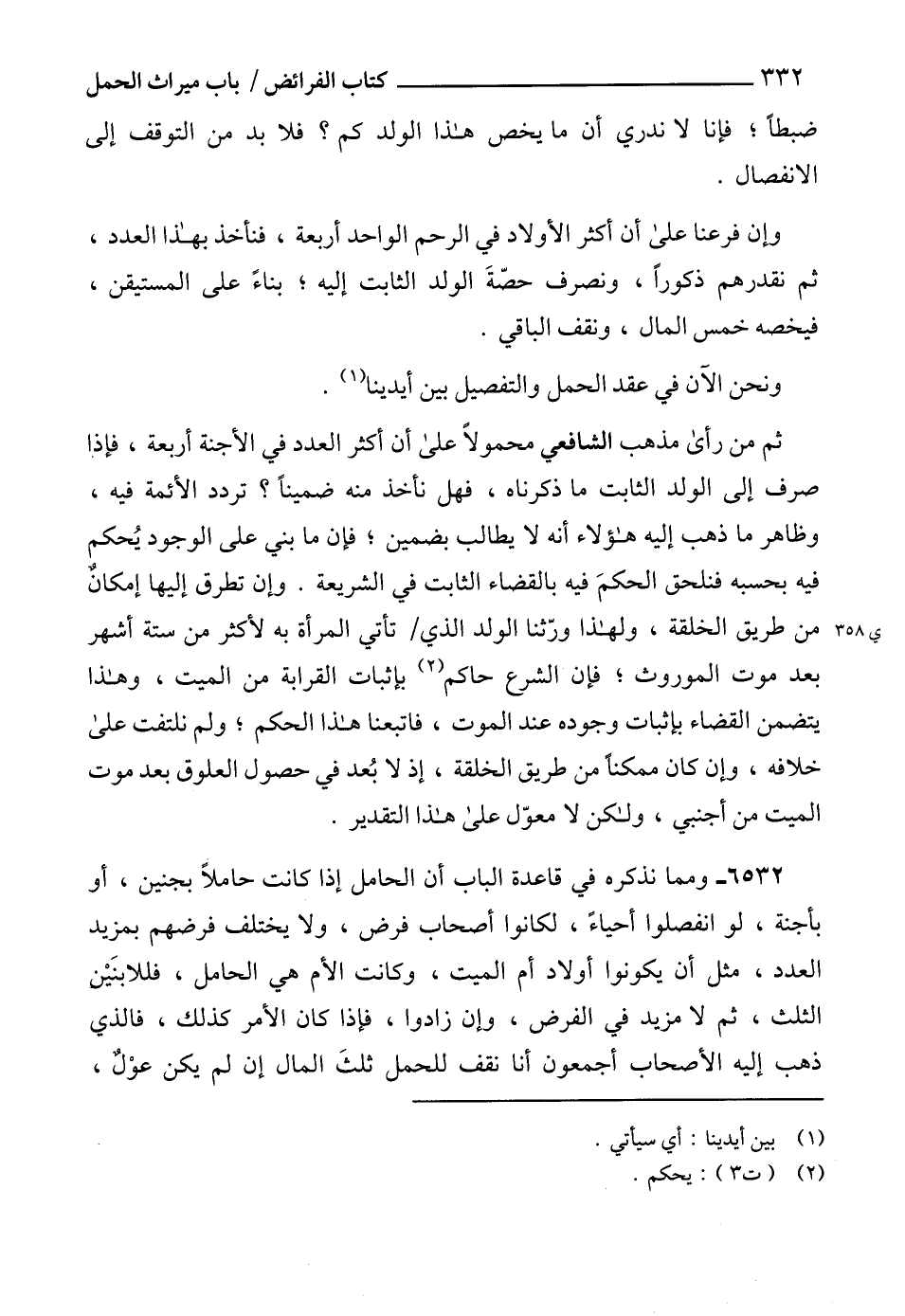 6532 - ومما نذكره في قاعدة الباب أن الحامل إذا كانت حاملاً بجنين، أو بأجنة، لو انفصلوا أحياءً، لكانوا أصحاب فرض، ولا يختلف فرضهم بمزيد العدد، مثل أن يكونوا أولاد أم الميت، وكانت الأم هي الحامل، فللابنَيْن الثلث، ثم لا مزيد في الفرض، وإن زادوا، فإذا كان الأمر كذلك، فالذي ذهب إليه الأصحاب أجمعون أنا نقف للحمل ثلثَ المال إن لم يكن عوْلٌ،