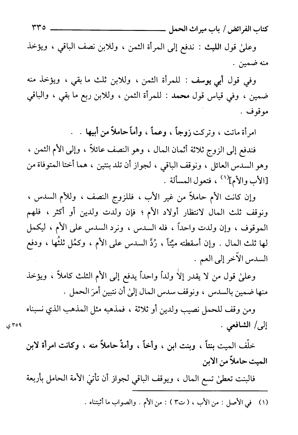 وإن كانت الأم حاملاً من غير الأب، فللزوج النصف، وللأم السدس، ونوقف ثلث المال لانتظار أولاد الأم؛ فإن ولدت ولدين أو أكثر، فلهم الموقوف، وإن ولدت واحداً، فله السدس، ونرد السدس على الأم، ليكمل لها ثلث المال. وإن أسقطته ميِّتاً، رُدَّ السدس على الأم، وكمُل ثلثُها، ودفع السدس الآخر إلى العم.