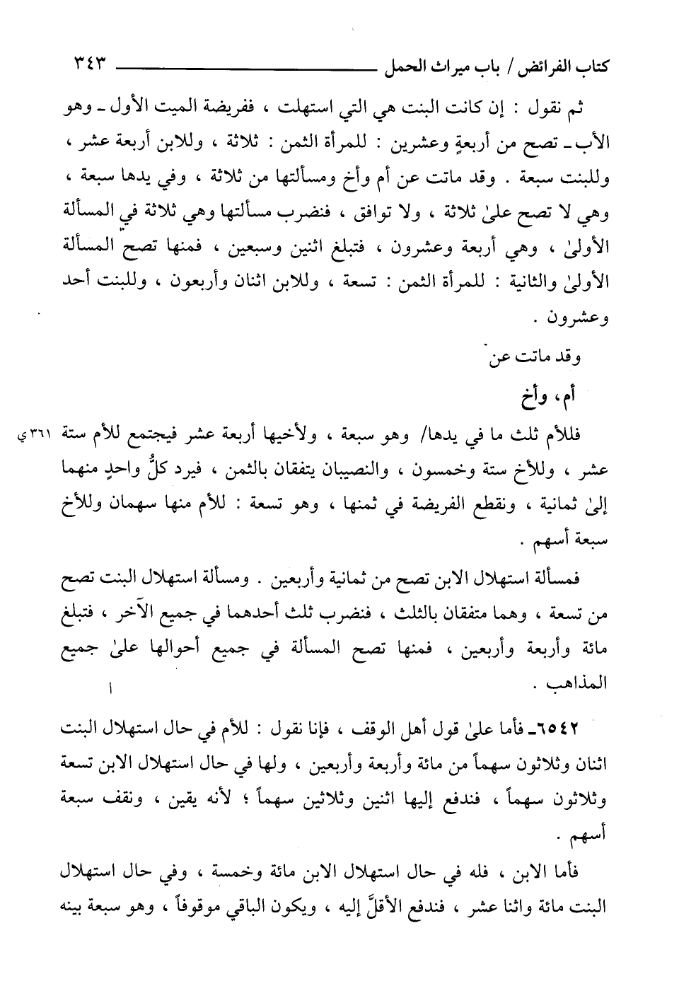 6542 - فأما على قول أهل الوقف، فإنا نقول: للأم في حال استهلال البنت اثنان وثلاثون سهماً من مائة وأربعة وأربعين، ولها في حال استهلال الابن تسعة وثلاثون سهماً، فندفع إليها اثنين وثلاثين سهماً؛ لأنه يقين، ونقف سبعة أسهم.