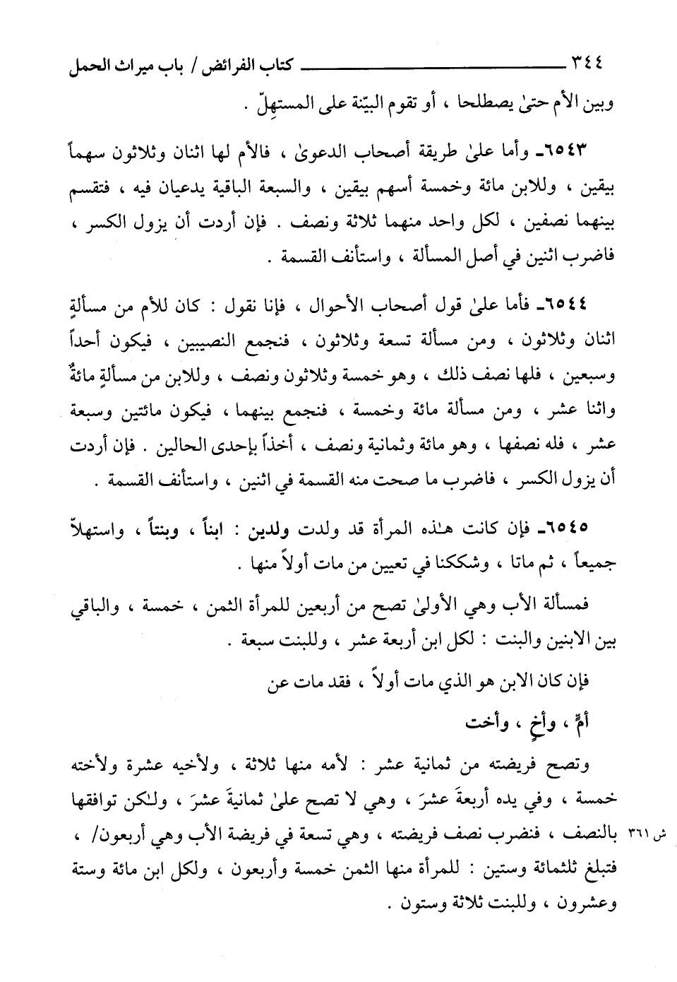 6544 - فأما على قول أصحاب الأحوال، فإنا نقول: كان للأم من مسألةٍ اثنان وثلاثون، ومن مسألة تسعة وثلاثون، فنجمع النصيبين، فيكون أحداً وسبعين، فلها نصف ذلك، وهو خمسة وثلاثون ونصف، وللابن من مسألةٍ مائةٌ واثنا عشر، ومن مسألة مائة وخمسة، فنجمع بينهما، فيكون مائتين وسبعة عشر، فله نصفها، وهو مائة وثمانية ونصف، أخذاً بإحدى الحالين. فإن أردت أن يزول الكسر، فاضرب ما صحت منه القسمة في اثنين، واستأنف القسمة.