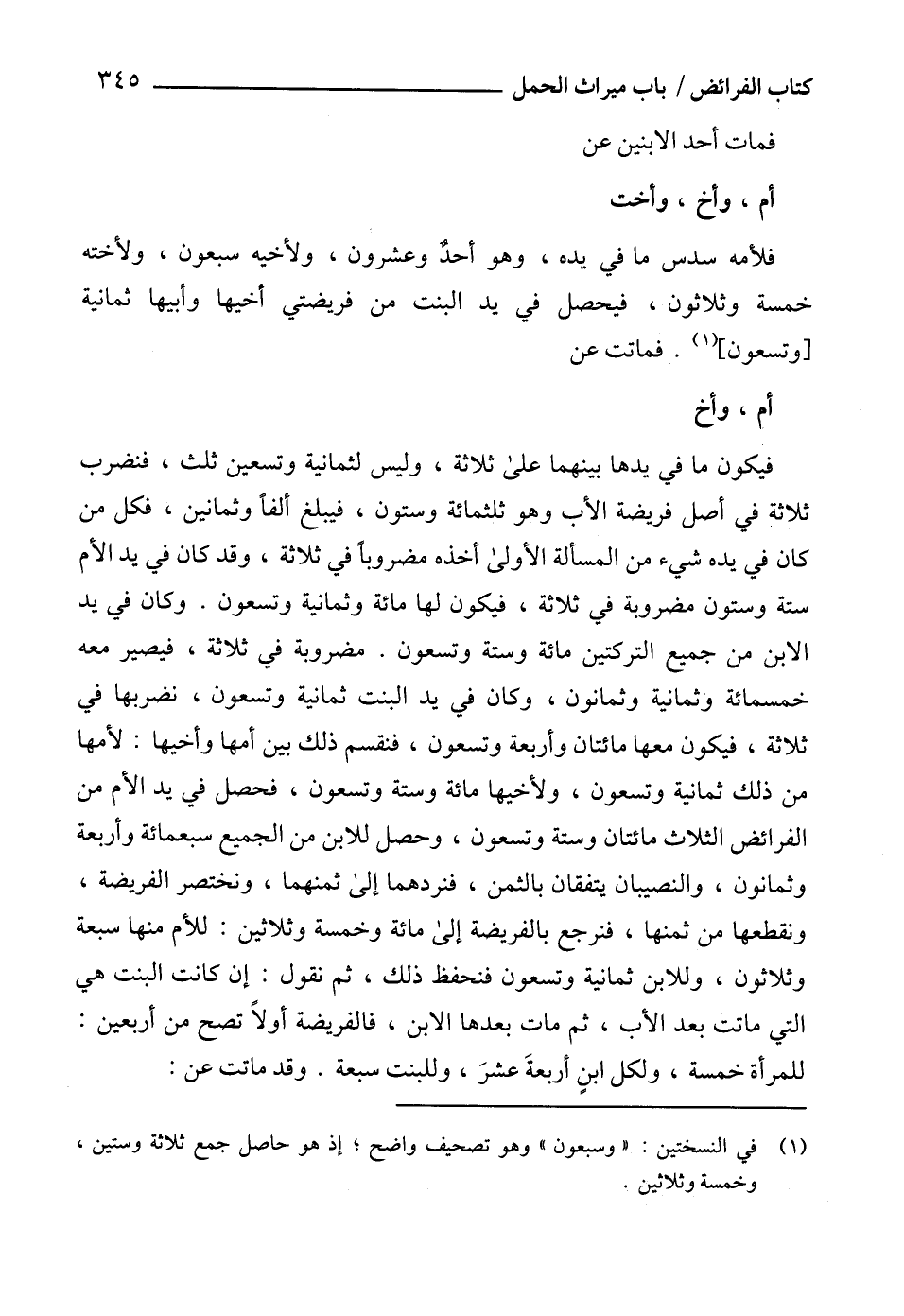 فيكون ما في يدها بينهما على ثلاثة، وليس لثمانية وتسعين ثلث، فنضرب ثلاثة في أصل فريضة الأب وهو ثلثمائة وستون، فيبلغ ألفاً وثمانين، فكل من كان في يده شيء من المسألة الأولى أخذه مضروباً في ثلاثة، وقد كان في يد الأم ستة وستون مضروبة في ثلاثة، فيكون لها مائة وثمانية وتسعون. وكان في يد الابن من جميع التركتين مائة وستة وتسعون. مضروبة في ثلاثة، فيصير معه خمسمائة وثمانية وثمانون، وكان في يد البنت ثمانية وتسعون، نضربها في ثلاثة، فيكون معها مائتان وأربعة وتسعون، فنقسم ذلك بين أمها وأخيها: لأمها من ذلك ثمانية وتسعون، ولأخيها مائة وستة وتسعون، فحصل في يد الأم من الفرائض الثلاث مائتان وستة وتسعون، وحصل للابن من الجميع سبعمائة وأربعة وثمانون، والنصيبان يتفقان بالثمن، فنردهما إلى ثمنهما، ونختصر الفريضة، ونقطعها من ثمنها، فنرجع بالفريضة إلى مائة وخمسة وثلاثين: للأم منها سبعة وثلاثون، وللابن ثمانية وتسعون فنحفظ ذلك، ثم نقول: إن كانت البنت هي التي ماتت بعد الأب، ثم مات بعدها الابن، فالفريضة أولاً تصح من أربعين: للمرأة خمسة، ولكل ابنٍ أربعةَ عشرَ، وللبنت سبعة. وقد ماتت عن:
