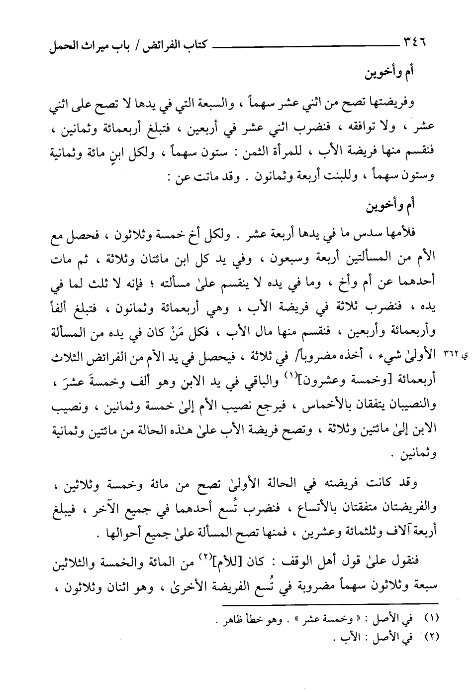 فنقول على قول أهل الوقف: كان [للأم] (2) من المائة والخمسة والثلاثين سبعة وثلاثون سهماً مضروبة في تُسع الفريضة الأخرى، وهو اثنان وثلاثون،