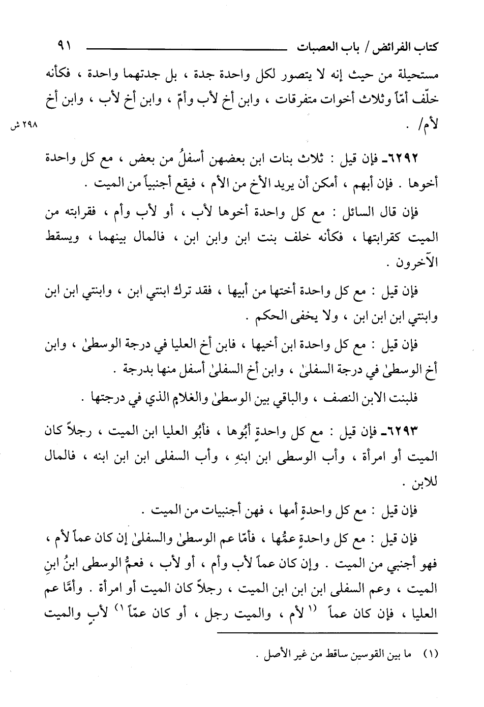 6293 - فإن قيل: مع كل واحدةٍ أبُوها، فأبُو العليا ابن الميت، رجلاً كان الميت أو امرأة، وأب الوسطى ابن ابنهِ، وأب السفلى ابن ابن ابنه، فالمال للابن.