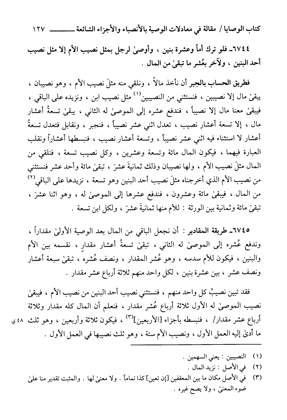 6745 - طريقة المقادير: أن نجعل الباقي من المال بعد الوصية الأولى مقداراً، وندفع عُشره إلى الموصى له الثاني، تبقى تسعةُ أعشار مقدارٍ، نقسمه بين الأم والبنين، فيكون للأم سدسه، وهو عُشر المقدار، ونصف عُشره، تبقى سبعة أعشار ونصف عشر، بين عشرة بنين، لكل واحد منهم ثلاثة أرباع عشر مقدار.