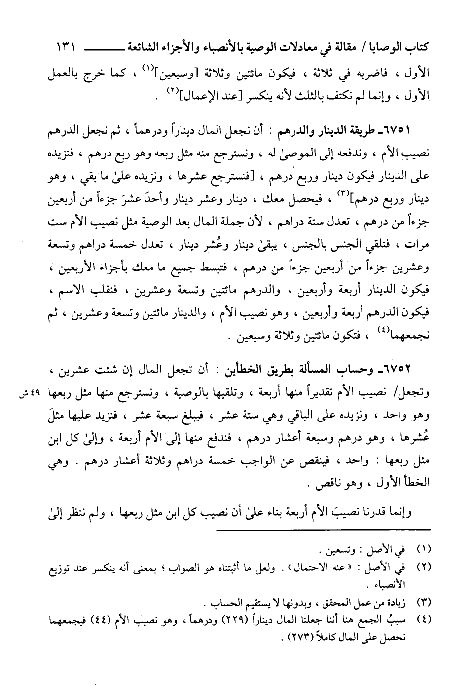 (4) سببُ الجمع هنا أننا جعلنا المال ديناراً (229) ودرهماً، وهو نصيب الأم (44) فبجمعهما نحصل على المال كاملاً (273).