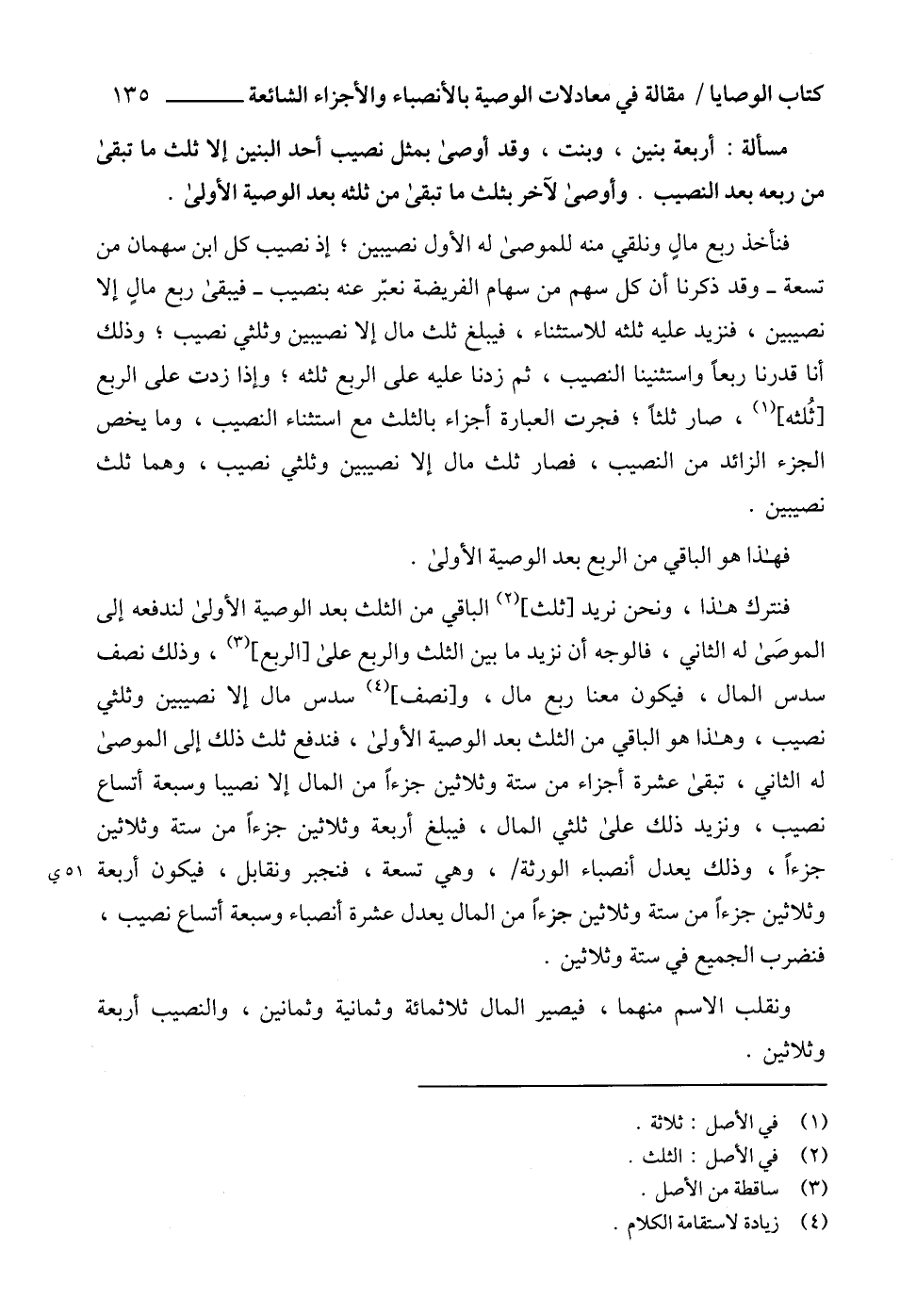 فنترك هذا، ونحن نريد [ثلث] (2) الباقي من الثلث بعد الوصية الأولى لندفعه إلى الموصَى له الثاني، فالوجه أن نزيد ما بين الثلث والربع على [الربع] (3)، وذلك نصف سدس المال، فيكون معنا ربع مال، و [نصف] (4) سدس مال إلا نصيبين وثلثي نصيب، وهذا هو الباقي من الثلث بعد الوصية الأولى، فندفع ثلث ذلك إلى الموصى له الثاني، تبقى عشرة أجزاء من ستة وثلاثين جزءاً من المال إلا نصيباً وسبعة أتساع نصيب، ونزيد ذلك على ثلثي المال، فيبلغ أربعة وثلاثين جزءاً من ستة وثلاثين جزءاً، وذلك يعدل أنصباء الورثة، وهي تسعة، فنجبر ونقابل، فيكون أربعة وثلاثين جزءاً من ستة وثلاثين جزءاً من المال يعدل عشرة أنصباء وسبعة أتساع نصيب، فنضرب الجميع في ستة وثلاثين.