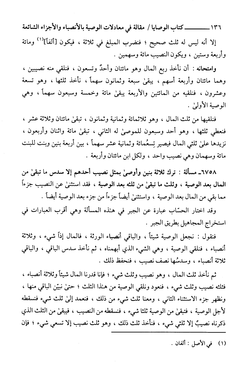6758 - مسألة: ترك ثلاثة بنين وأوصى بمثل نصيب أحدهم إلا سدس ما تبقى من المال بعد الوصية، وثلث ما تبقى من ثلثه بعد الوصية، فقد استثنى عن النصيب جزءاً مما بقي من المال بعد الوصية، واستثنى أيضاً جزءاً من جزء بعد الوصية أيضاً.