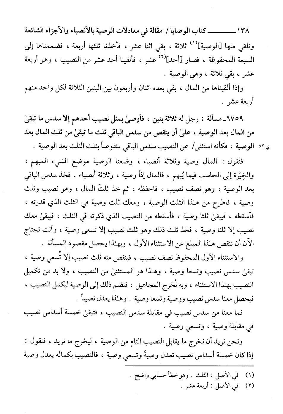 فنقول: المال وصية وثلاثة أنصباء، وضعنا الوصية موضع الشيء المبهم، والخِيَرة إلى الحاسب فيما يُبهم، فالمال إذاً وصية، وثلاثة أنصباء. فخذ سدس الباقي بعد الوصية، وهو نصف نصيب، فاحفظه، ثم خذ ثلثَ المال، وهو نصيب وثلث وصية، فاطرح من هذا الثلث الوصية، ومعك ثلث وصية في الثلث الذي قدرته، فاسقطه، فيبقى ثلثا وصية، فأسقطه من النصيب الذي ذكرته في الثلث، فيبقى معك نصيب إلا ثلثا وصية، فخذ ثلث ذلك وهو ثلث نصيب إلا تسعي وصية، وأنت تحتاج الآن أن تنقص هذا المبلغ عن الاستثناء الأول، وبهذا يحصل مقصود المسألة.