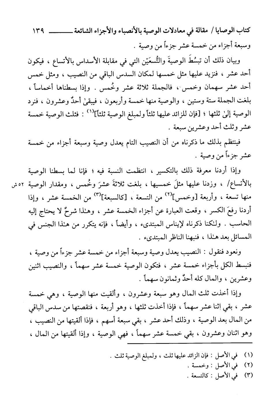 وإذا أردنا معرفة ذلك بالتكسير، انتظمت النسبة فيه؛ فإنا لما بسطنا الوصية بالأتساع، وزدنا عليها مثلَ خمسيها، بلغت ثلاثةَ عشرَ وخُمس، ومقدار الوصية منها تسعة، وأربعة [وخمس] (2) من التسعة، [كالسبعة] (3) من الخمسة عشر، وإذا أردنا رفعَ الكسر، وقعت العبارة عن أجزاء الخمسة عشر، وهذا شرحٌ لا يحتاج إليه الحاسب. ولكنا ذكرناه لإيناس المبتدىء، وأيضاً، فإنه يتكرر من هذا الجنس في المسائل بعد هذا، فنبهنا الناظر المبتدىء.
