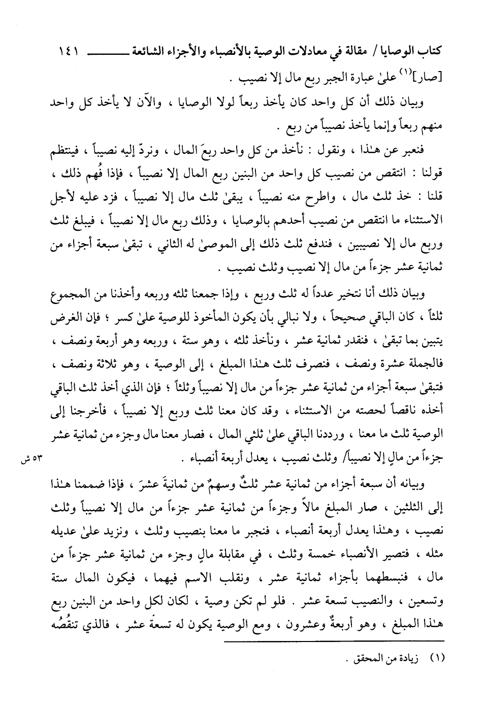 وبيان ذلك أنا نتخير عدداً له ثلث وربع، وإذا جمعنا ثلثه وربعه وأخذنا من المجموع ثلثاً، كان الباقي صحيحاً، ولا نبالي بأن يكون المأخوذ للوصية على كسر؛ فإن الغرض يتبين بما تبقى، فنقدر ثمانية عشر، ونأخذ ثلثه، وهو ستة، وربعه وهو أربعة ونصف، فالجملة عشرة ونصف، فنصرف ثلث هذا المبلغ، إلى الوصية، وهو ثلاثة ونصف، فتبقى سبعة أجزاء من ثمانية عشر جزءاً من مال إلا نصيباً وثلثاً؛ فإن الذي أخذ ثلث الباقي أخذه ناقصاً لحصته من الاستثناء، وقد كان معنا ثلث وربم إلا نصيباً، فأخرجنا إلى الوصية ثلث ما معنا، ورددنا الباقي على ثلثي المال، فصار معنا مال وجزء من ثمانية عشر جزءاً من مالٍ إلا نصيباً وثلث نصيب، يعدل أربعة أنصباء.