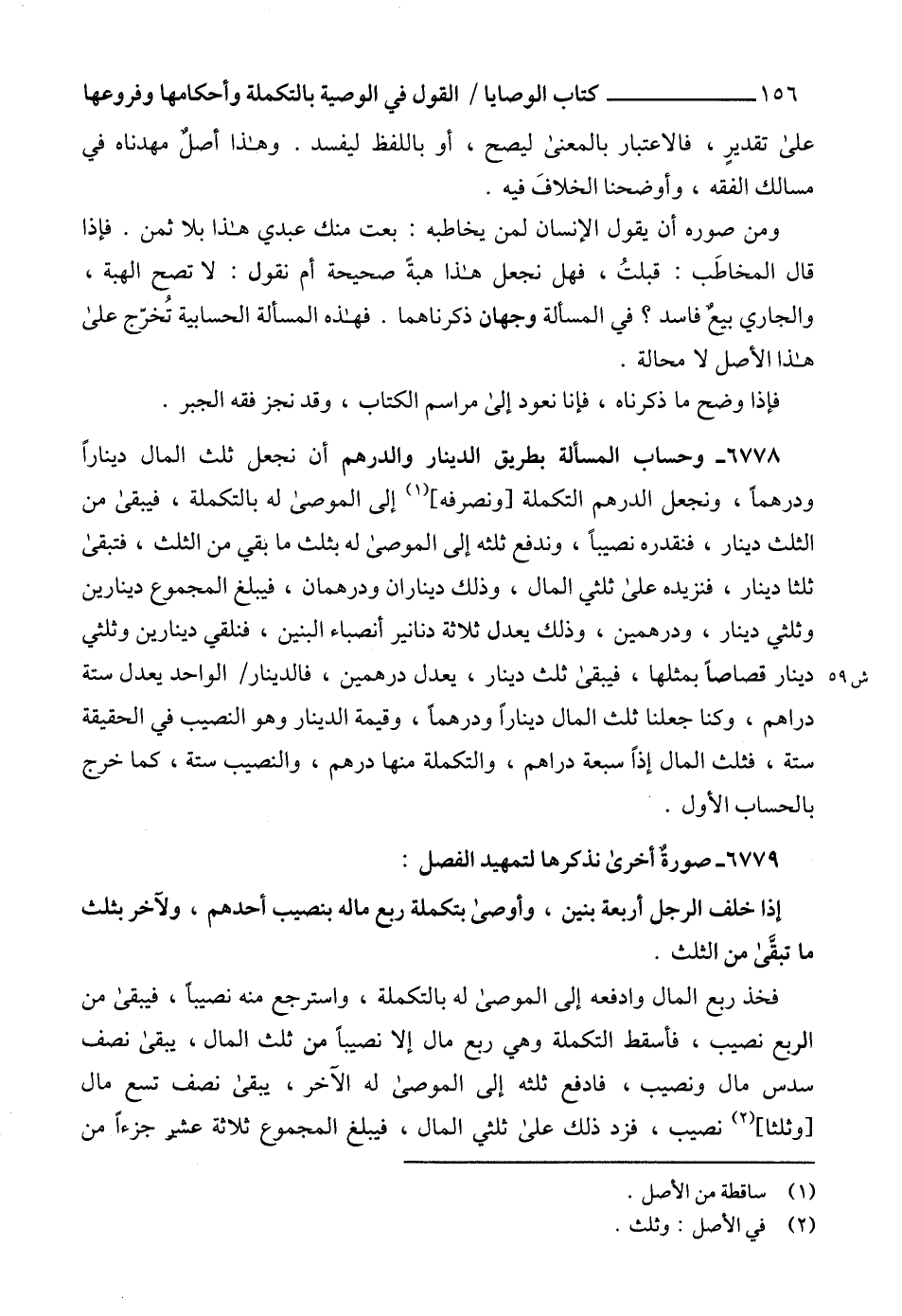 6778 - وحساب المسألة بطريق الدينار والدرهم أن نجعل ثلث المال ديناراً ودرهماً، ونجعل الدرهم التكملة [ونصرفه] (1) إلى الموصى له بالتكملة، فيبقى من الثلث دينار، فنقدره نصيباً، وندفع ثلثه إلى الموصى له بثلث ما بقي من الثلث، فتبقى ثلثا دينار، فنزيده على ثلثي المال، وذلك ديناران ودرهمان، فيبلغ المجموع دينارين وثلثي دينار، ودرهمين، وذلك يعدل ثلاثة دنانير أنصباء البنين، فنلقي دينارين وثلثي دينار قصاصاً بمثلها، فيبقى ثلث دينار، يعدل درهمين، فالدينار الواحد يعدل ستة دراهم، وكنا جعلنا ثلث المال ديناراً ودرهماً، وقيمة الدينار وهو النصيب في الحقيقة ستة، فثلث المال إذاً سبعة دراهم، والتكملة منها درهم، والنصيب ستة، كما خرج بالحساب الأول.