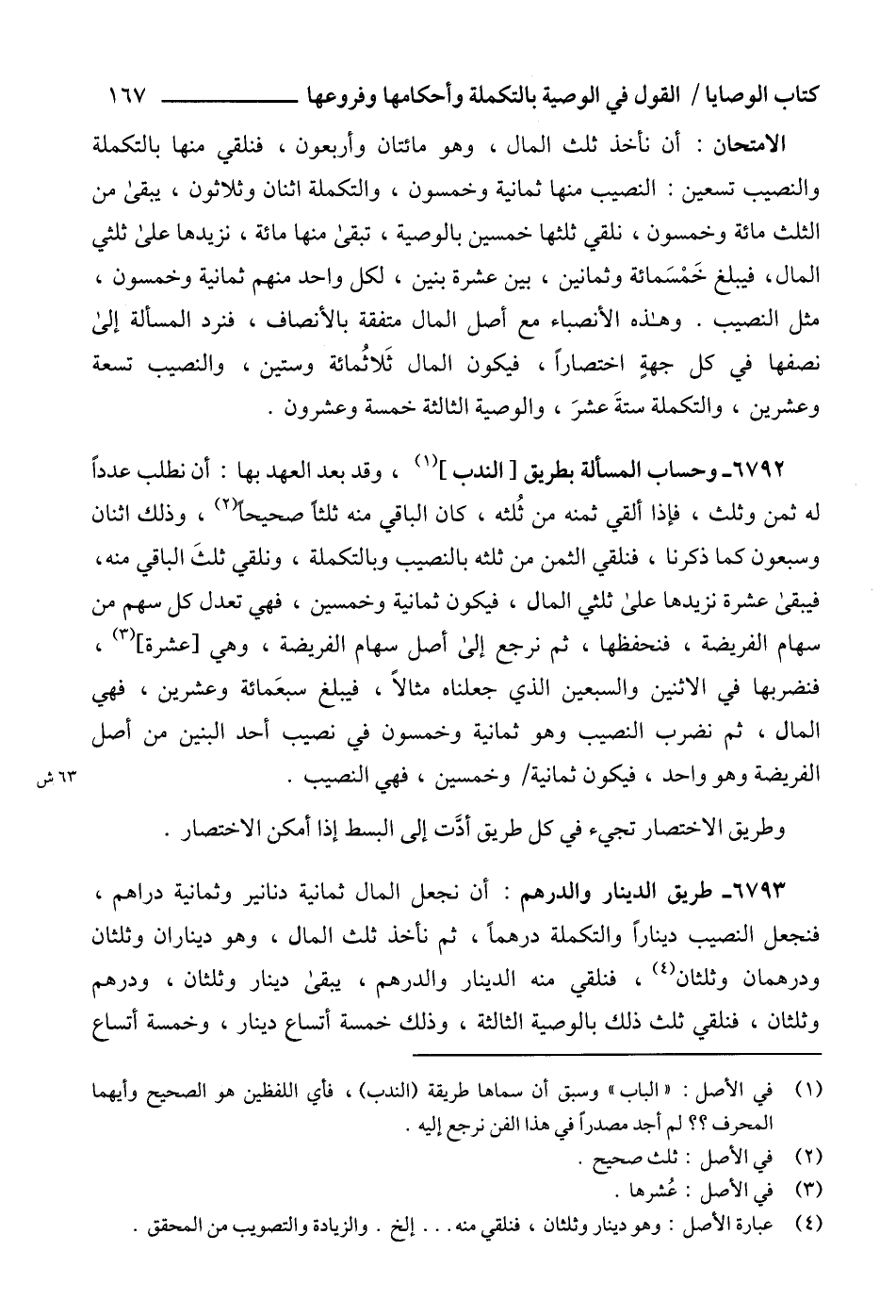 6793 - طريق الدينار والدرهم: أن نجعل المال ثمانية دنانير وثمانية دراهم، فنجعل النصيب ديناراً والتكملة درهماً، ثم نأخذ ثلث المال، وهو ديناران وثلثان ودرهمان وثلثان (4)، فنلقي منه الدينار والدرهم، يبقى دينار وثلثان، ودرهم وثلثان، فنلقي ثلث ذلك بالوصية الثالثة، وذلك خمسة أتساع دينار، وخمسة أتساع