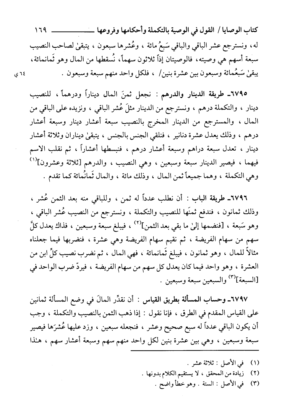 6796 - طريقة الباب: أن نطلب عدداً له ثمن، وللباقي منه بعد الثمن عُشر، وذلك ثمانون، فندفع ثمنَها للنصيب والتكملة، ونسترجع من النصيب عُشر الباقي، وهو سَبعة، [فنضمها إلى ما بقي بعد الثمن] (2)، فيبلغ سبعة وسبعين، فذاك يعدل كلَّ سهم من سهام الفريضة، ثم نقيم سهام الفريضة وهي عشرة، فنضربها فيما جعلناه مثالاً للمال، وهو ثمانون، فيبلغ ثَمانمائة، فهي المال، ثم نضرب نصيب كلِّ ابن من العشرة، وهو واحد فيما كان يعدل كل سهم من سهام الفريضة، فيردّ ضرب الواحد في [السبعة] (3) والسبعين سبعة وسبعين.