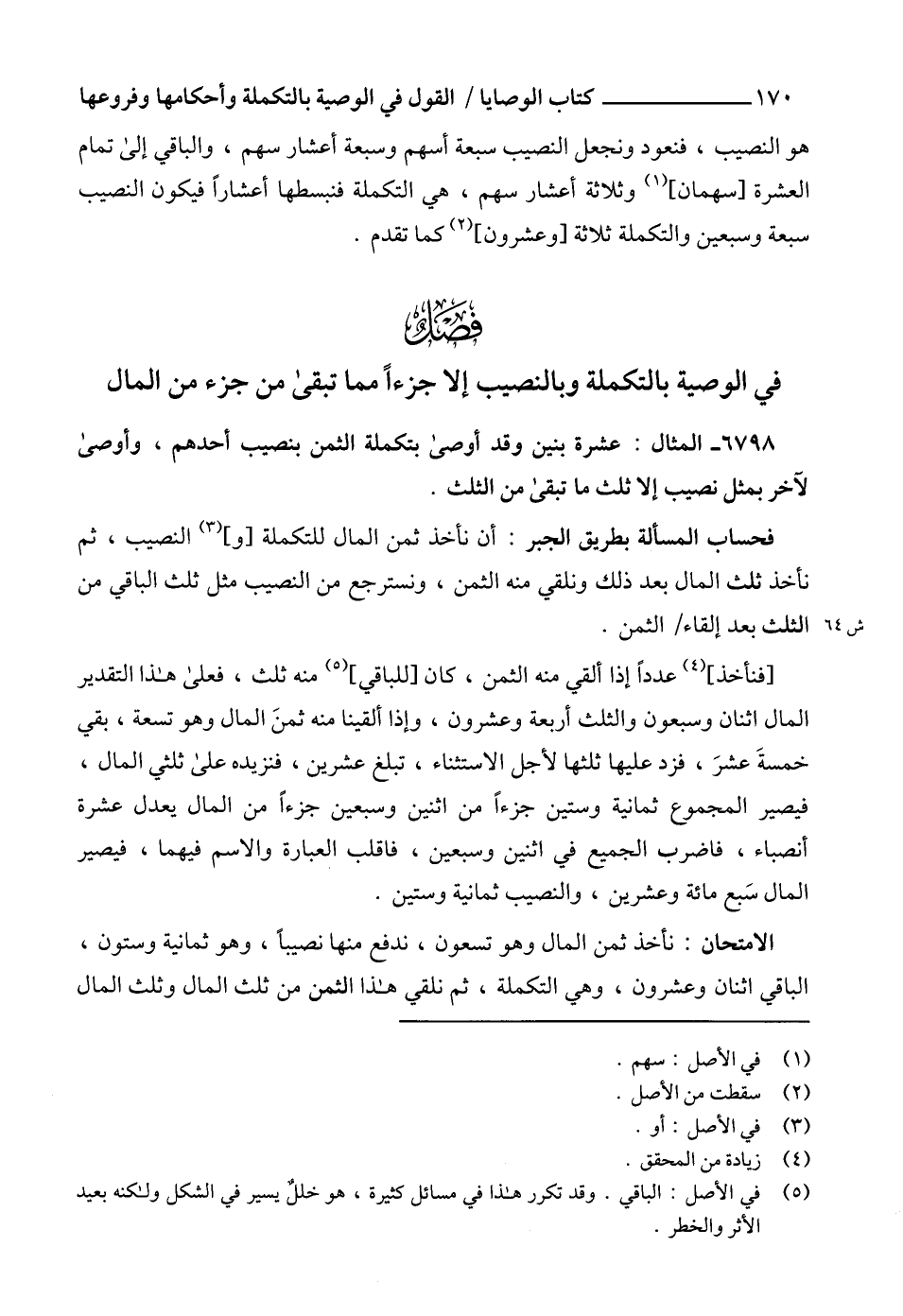 هو النصيب، فنعود ونجعل النصيب سبعة أسهم وسبعة أعشار سهم، والباقي إلى تمام العشرة [سهمان] (1) وثلاثة أعشار سهم، هي التكملة فنبسطها أعشاراً فيكون النصيب سبعة وسبعين والتكملة ثلاثة [وعشرون] (2) كما تقدم.