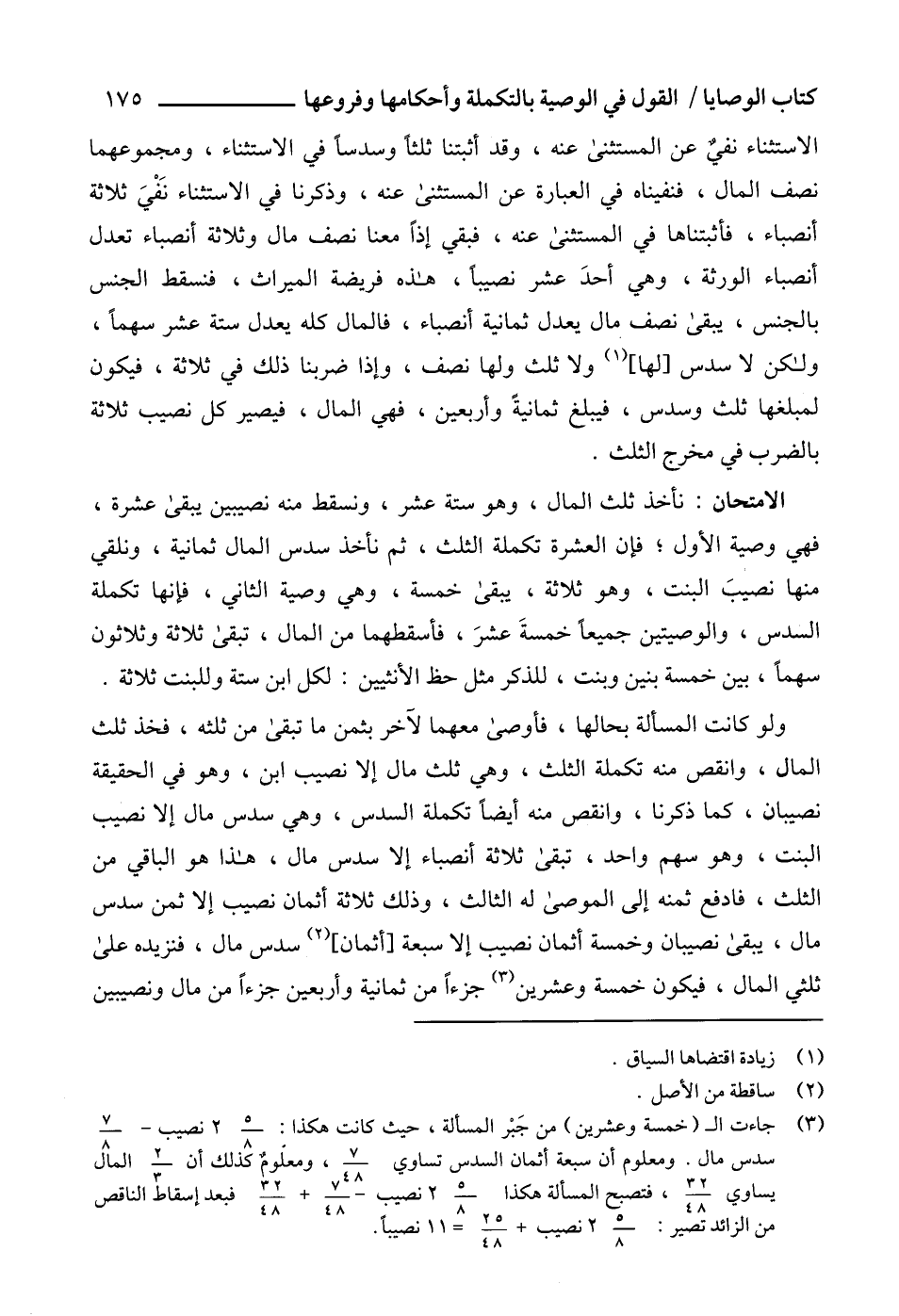 (3) جاءت الـ (خمسة وعشرين) من جَبْر المسألة، حيث كانت هكذا: 5/ 8 2 نصيب - 7/ 8 سدس مال. ومعلوم أن سبعة أثمان السدس تساوي 7/ 48، ومعلومٌ كذلك أن 2/ 3 المال يساوي 32/ 48، فتصبح المسألة هكذا 5/ 8 2 نصيب - 7/ 48 + 32/ 48 فبعد إسقاط الناقص من الزائد تصير: 5/ 8 2 نصيب + 25/ 48 = 11 نصيباً.