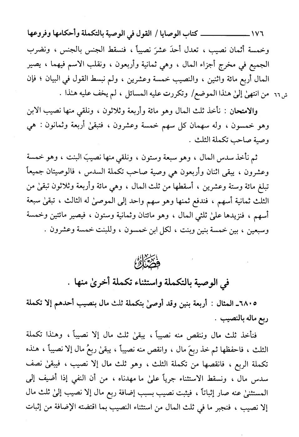6805 - المثال: أربعة بنين وقد أوصى بتكملة ثلث مال بنصيب أحدهم إلا تكملة ربع ماله بالنصيب.