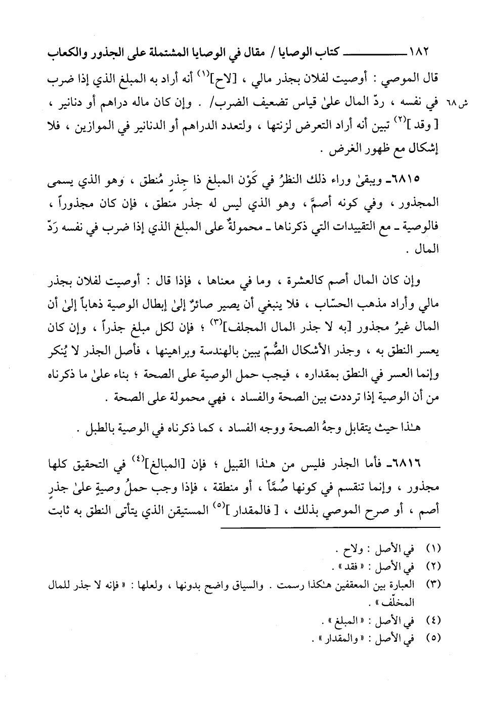 6815 - ويبقى وراء ذلك النظرُ في كَوْن المبلغ ذا جِذرٍ مُنطق، وهو الذي يسمى المجذور، وفي كونه أصمَّ، وهو الذي ليس له جذر منطق، فإن كان مجذوراً، فالوصية -مع التقييدات التي ذكرناها- محمولةٌ على المبلغ الذي إذا ضرب في نفسه رَدّ المال.