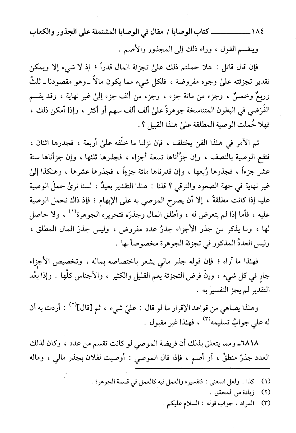 6818 - ومما يتعلق بذلك أن فريضة الموصي لو كانت تقسم من عدد، وكان لذلك العدد جذرٌ منطقٌ، أو أصم، فإذا قال الموصي: أوصيت لفلان بجذر مالي، وماله