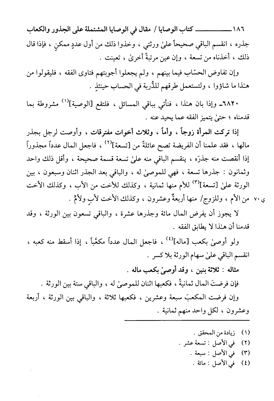 جذره، انقسم الباقي صحيحاً على ورثتي، وخذوا ذلك من أول عددٍ ممكنٍ، فإذا قال ذلك، أخذناه من تسعة، وإن عين مرتبةً أخرى، تعينت.