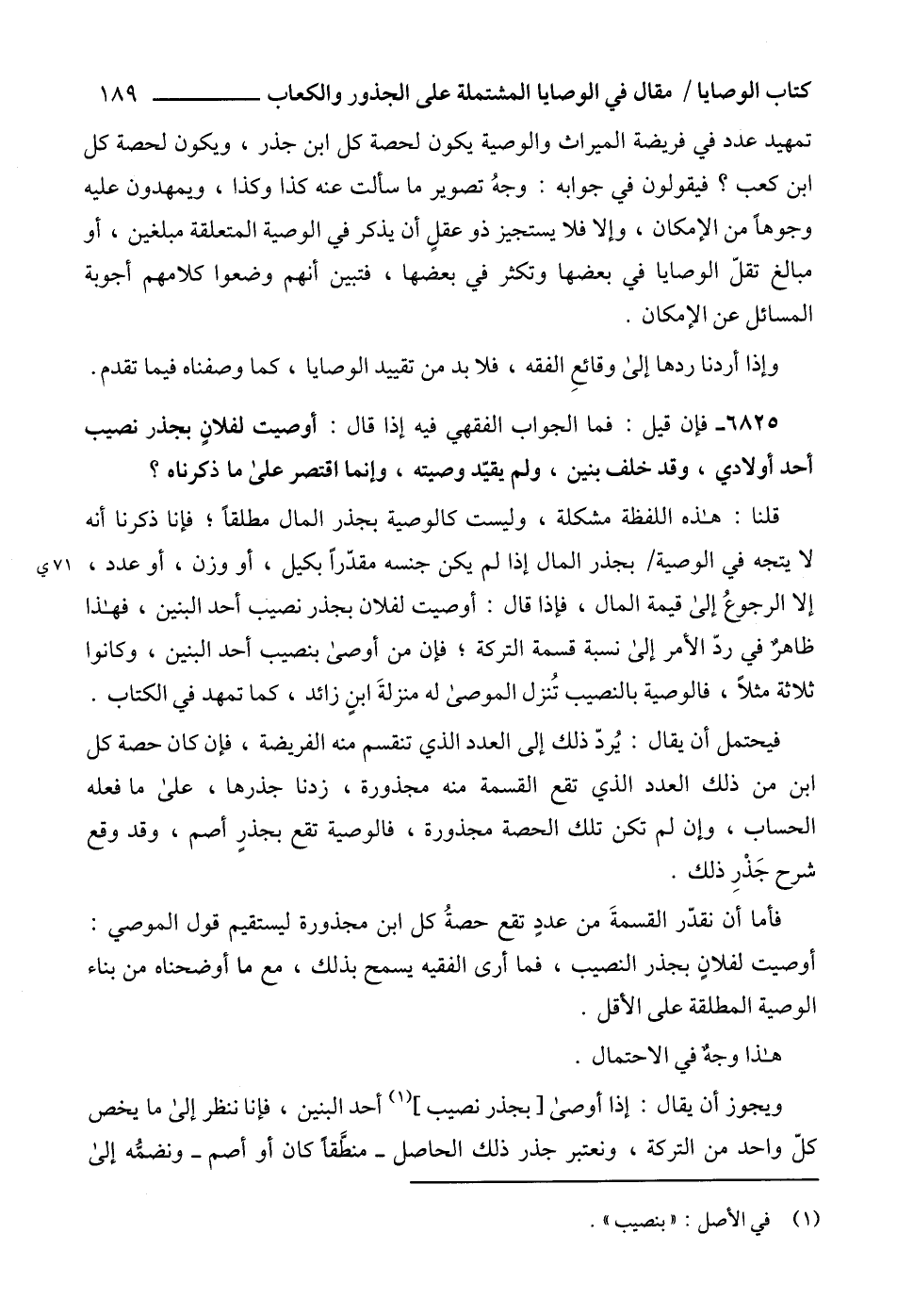 تمهيد عدد في فريضة الميراث والوصية يكون لحصة كل ابن جذر، ويكون لحصة كل ابن كعب؟ فيقولون في جوابه: وجهُ تصوير ما سألت عنه كذا وكذا، ويمهدون عليه وجوهاً من الإمكان، وإلا فلا يستجيز ذو عقلٍ أن يذكر في الوصية المتعلقة مبلغين، أو مبالغ تقلّ الوصايا في بعضها وتكثر في بعضها، فتبين أنهم وضعوا كلامهم أجوبة المسائل عن الإمكان.