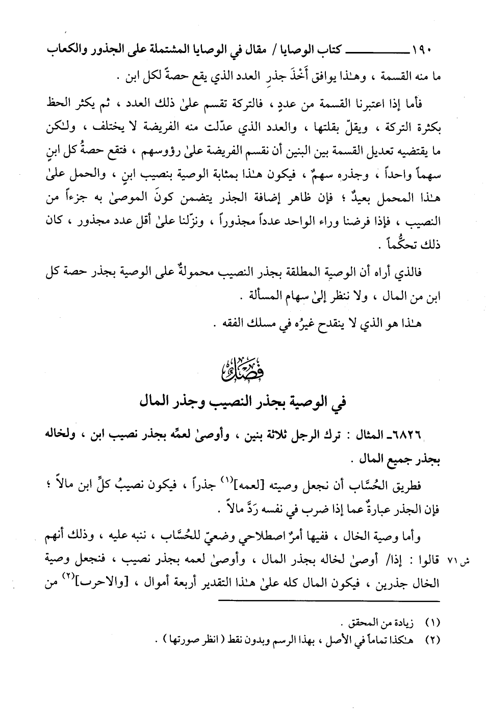 فالذي أراه أن الوصية المطلقة بجذر النصيب محمولةٌ على الوصية بجذر حصة كل ابن من المال، ولا ننظر إلى سهام المسألة.