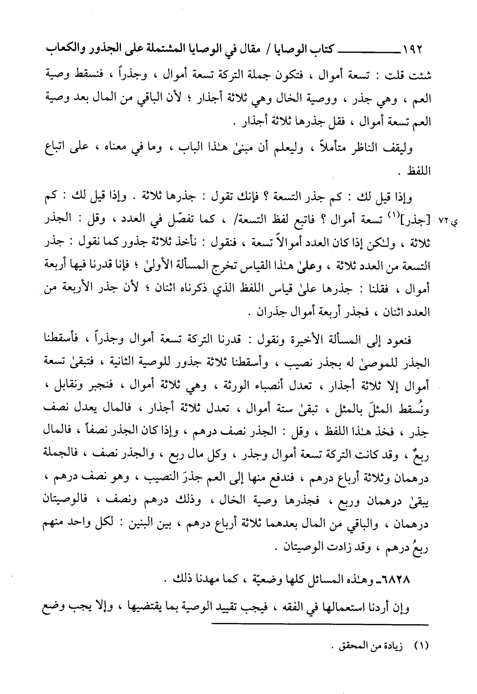 شئت قلت: تسعة أموال، فتكون جملة التركة تسعة أموال، وجذراً، فنسقط وصية العم، وهي جذر، ووصية الخال وهي ثلاثة أجذار؛ لأن الباقي من المال بعد وصية العم تسعة أموال، فقل جذرها ثلاثة أجذار.