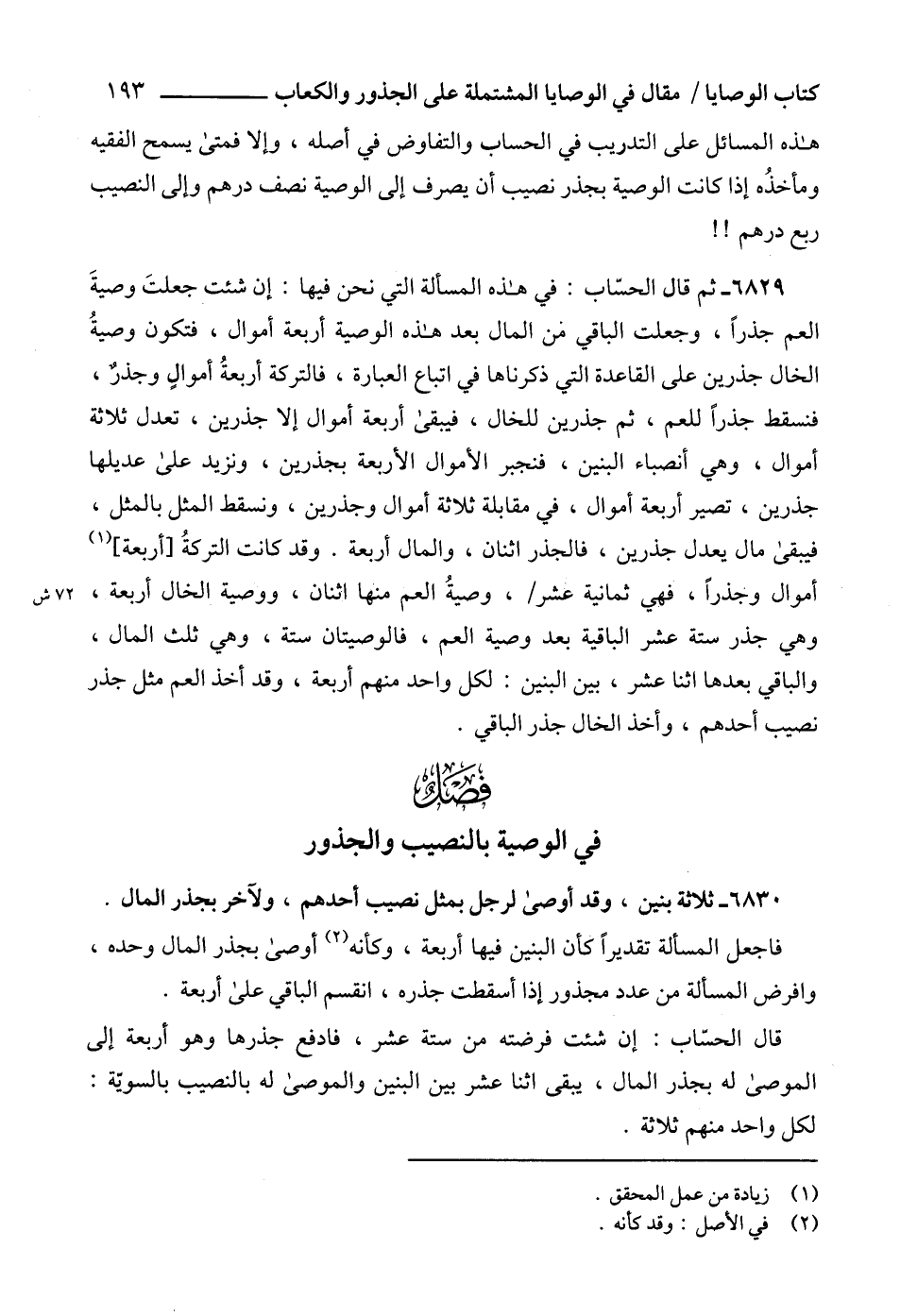 هذه المسائل على التدريب في الحساب والتفاوض في أصله، وإلا فمتى يسمح الفقيه ومأخذُه إذا كانت الوصية بجذر نصيب أن يصرف إلى الوصية نصف درهم وإلى النصيب ربع درهم!!
