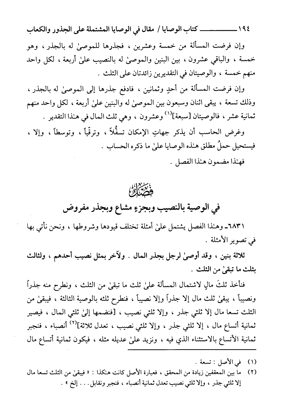 في الوصية بالنصيب وبجزءٍ مشاع وبجذر مفروض
