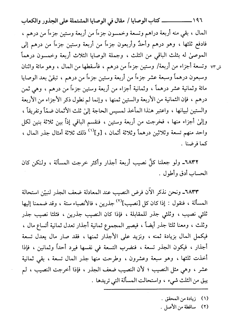 6832 - ولو جعلنا كلَّ نصيب أربعة أجذار وأكثر خرجت المسألة، ولكن كان الحساب أدق وأطول.