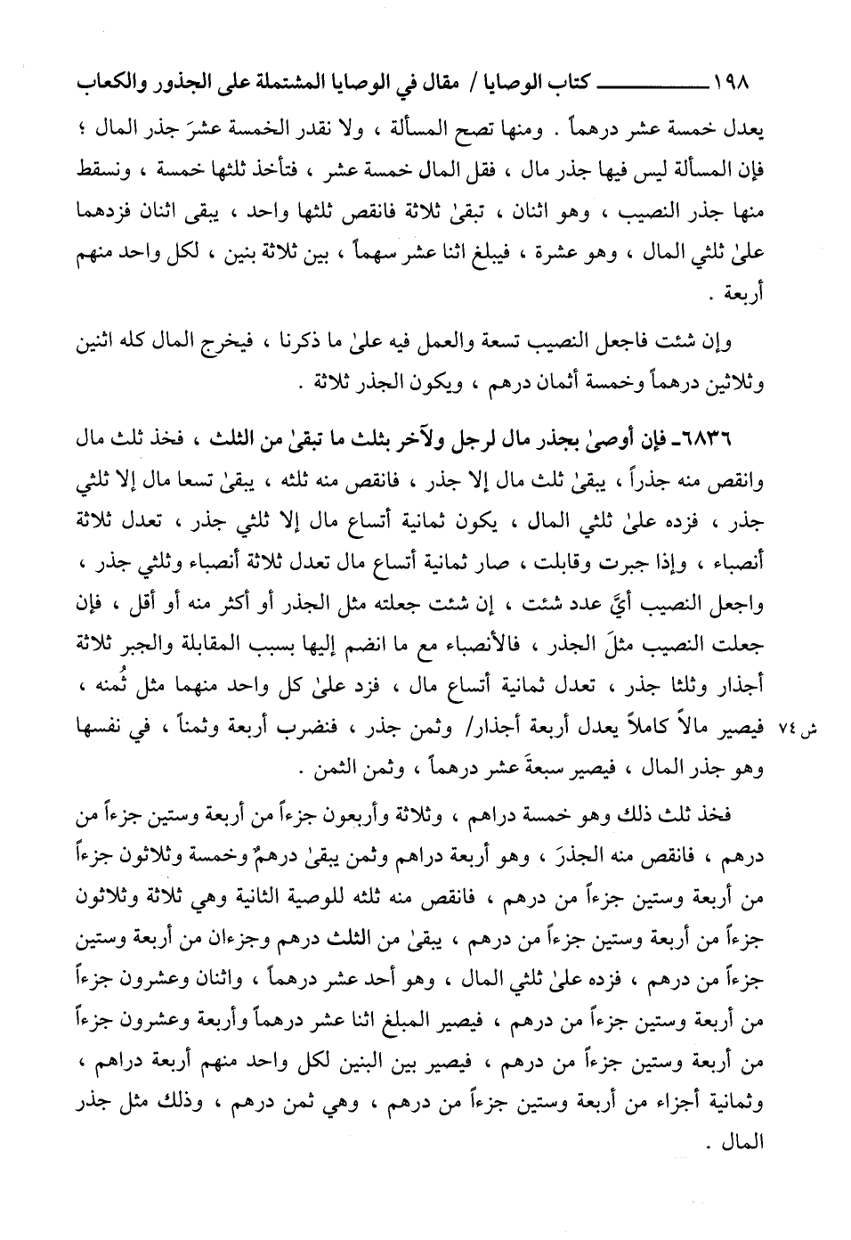 6836 - فإن أوصى بجذر مال لرجل ولآخر بثلث ما تبقى من الثلث، فخذ ثلث مال وانقص منه جذراً، يبقى ثلث مال إلا جذر، فانقص منه ثلثه، يبقى تسعا مال إلا ثلثي جذر، فزده على ثلثي المال، يكون ثمانية أتساع مال إلا ثلثي جذر، تعدل ثلاثة أنصباء، وإذا جبرت وقابلت، صار ثمانية أتساع مال تعدل ثلاثة أنصباء وثلثي جذر، واجعل النصيب أيَّ عدد شئت، إن شئت جعلته مثل الجذر أو أكثر منه أو أقل، فإن جعلت النصيب مثلَ الجذر، فالأنصباء مع ما انضم إليها بسبب المقابلة والجبر ثلاثة أجذار وثلثا جذر، تعدل ثمانية أتساع مال، فزد على كل واحد منهما مثل ثُمنه، فيصير مالاً كاملاً يعدل أربعة أجذار وثمن جذر، فنضرب أربعة وثمناً، في نفسها وهو جذر المال، فيصير سبعةَ عشر درهماً، وثمن الثمن.