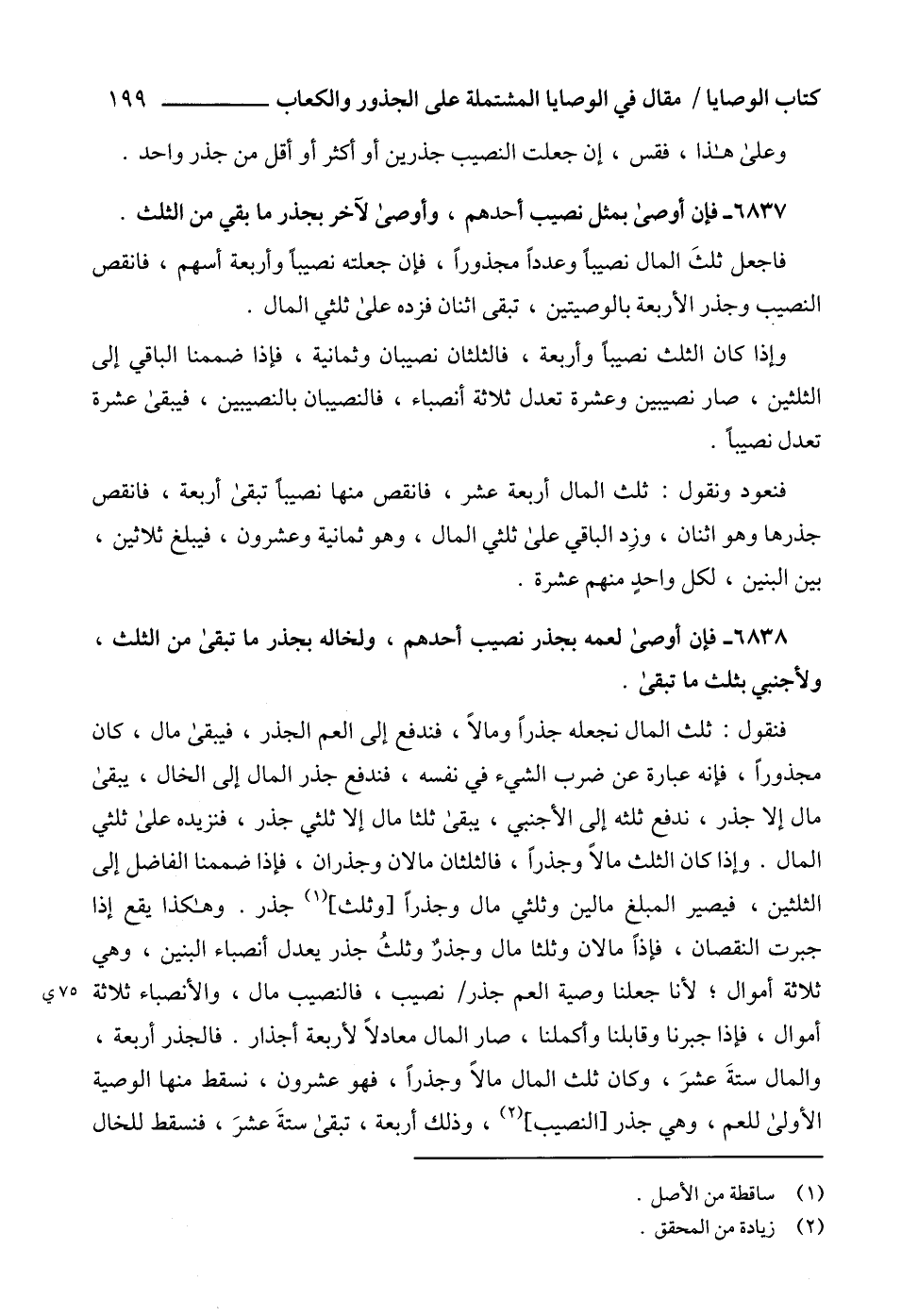 6838 - فإن أوصى لعمه بجذر نصيب أحدهم، ولخاله بجذر ما تبقى من الثلث، ولأجنبي بثلث ما تبقى.