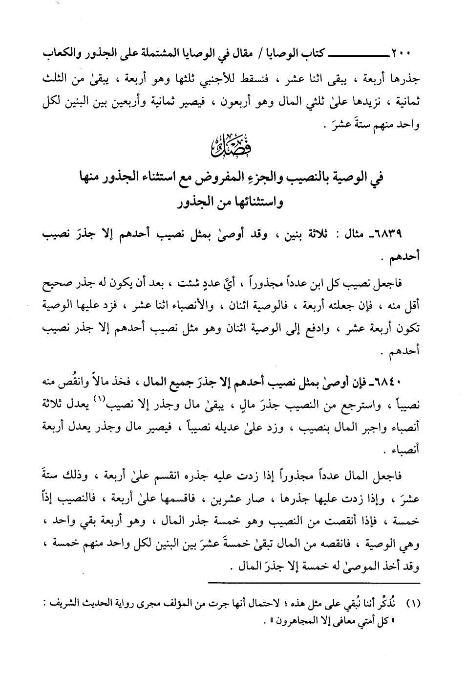 6840 - فإن أوصى بمثل نصيب أحدهم إلا جذرَ جميع المال، فخذ مالاً وانقُص منه نصيباً، واسترجع من النصيب جذرَ مالٍ، يبقى مال وجذر إلا نصيب (1) يعدل ثلاثة أنصباء واجبر المال بنصيب، وزد على عديله نصيباً، فيصير مال وجذر يعدل أربعة أنصباء.