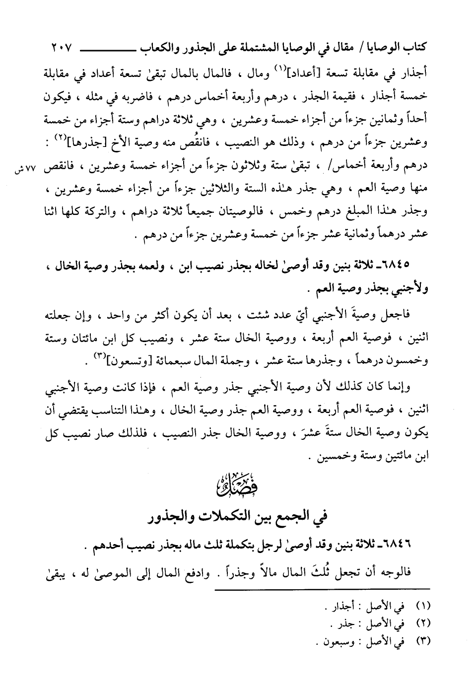 أجذار في مقابلة تسعة [أعداد] (1) ومال، فالمال بالمال تبقى تسعة أعداد في مقابلة خمسة أجذار، فقيمة الجذر، درهم وأربعة أخماس درهم، فاضربه في مثله، فيكون أحداً وثمانين جزءاً من أجزاء خمسة وعشرين، وهي ثلاثة دراهم وستة أجزاء من خمسة وعشرين جزءاً من درهم، وذلك هو النصيب، فانقُص منه وصية الأخ [جذرها] (2): درهم وأربعة أخماس، تبقى ستة وثلاثون جزءاً من أجزاء خمسة وعشرين، فانقص منها وصية العم، وهي جذر هذه الستة والثلاثين جزءاً من أجزاء خمسة وعشرين، وجذر هذا المبلغ درهم وخمس، فالوصيتان جميعاً ثلاثة دراهم، والتركة كلها اثنا عشر درهماً وثمانية عشر جزءاً من خمسة وعشرين جزءاً من درهم.