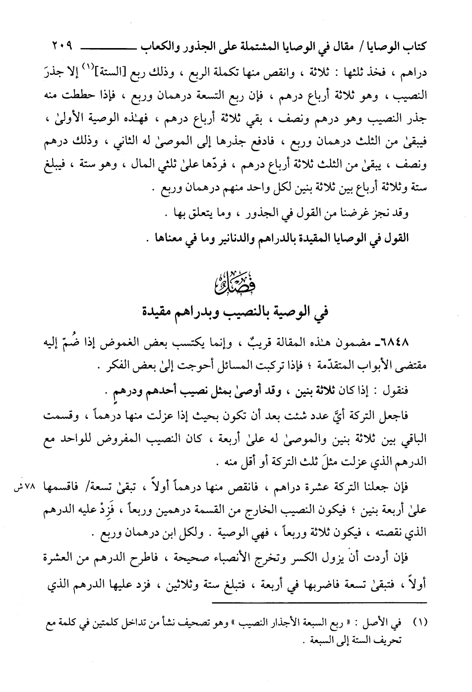 (1) في الأصل: " ربع السبعة الأجذار النصيب " وهو تصحيف نشأ من تداخل كلمتين في كلمة مع تحريف الستة إلى السبعة.
