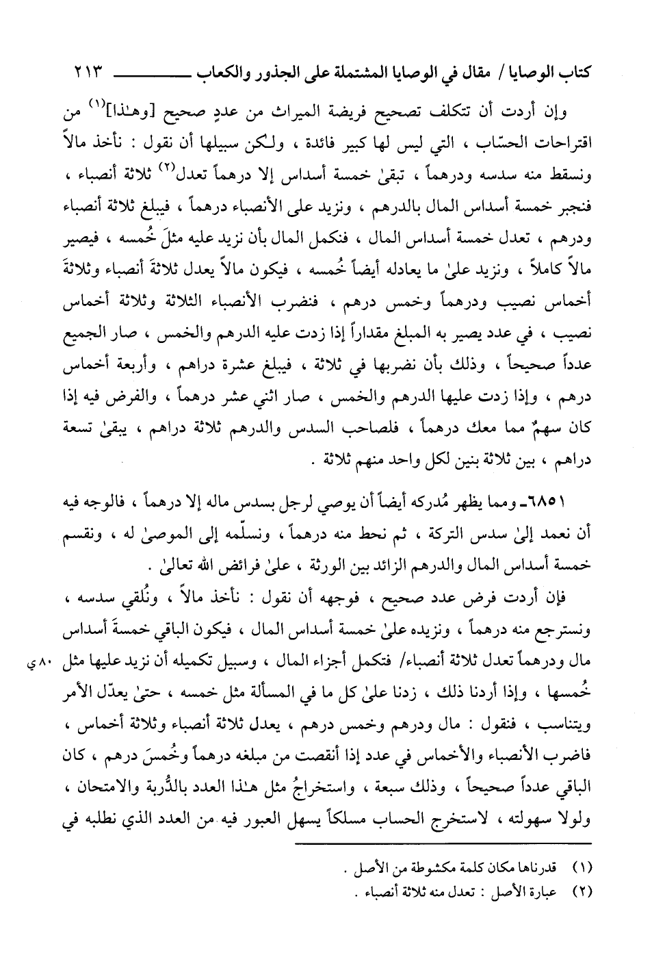 6851 - ومما يظهر مُدركه أيضاً أن يوصي لرجل بسدس ماله إلا درهماً، فالوجه فيه أن نعمد إلى سدس التركة، ثم نحط منه درهماً، ونسلّمه إلى الموصى له، ونقسم خمسة أسداس المال والدرهم الزائد بين الورثة، على فرائض الله تعالى.