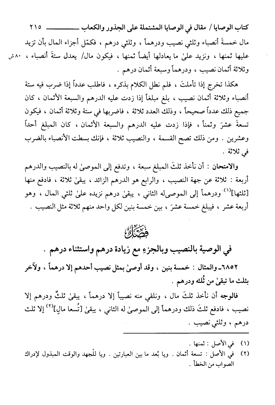 6852 - والمثال: خمسة بنين، وقد أوصى بمثل نصيب أحدهم إلا درهماً، ولآخر بثلث ما تبقى من ثُلثه ودرهم.