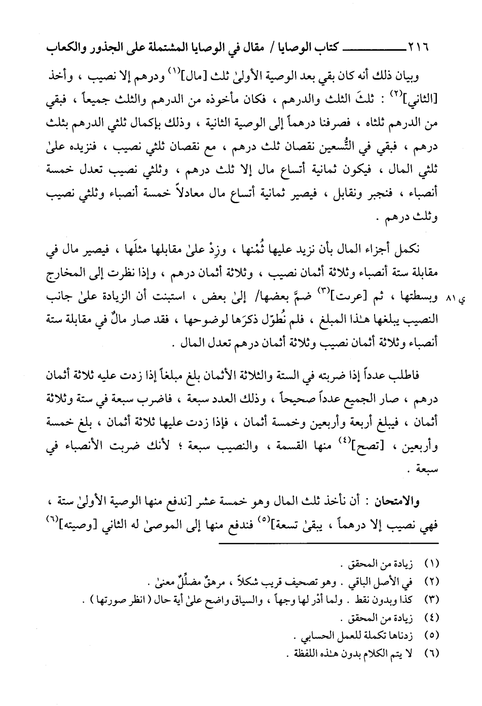 وبيان ذلك أنه بقى بعد الوصية الأولى ثلث [مال] (1) ودرهم إلا نصيب، وأخذ [الثاني] (2): ثلثَ الثلث والدرهم، فكان مأخوذه من الدرهم والثلث جميعاً، فبقي من الدرهم ثلثاه، فصرفنا درهماً إلى الوصية الثانية، وذلك بإكمال ثلثي الدرهم بثلث درهم، فبقي في التُّسعين نقصان ثلث درهم، مع نقصان ثلثي نصيب، فنزيده على ثلثي المال، فيكون ثمانية أتساع مال إلا ثلث درهم، وثلثي نصيب تعدل خمسة أنصباء، فنجبر ونقابل، فيصير ثمانية أتساع مال معادلاً خمسة أنصباء وثلثي نصيب وثلث درهم.
