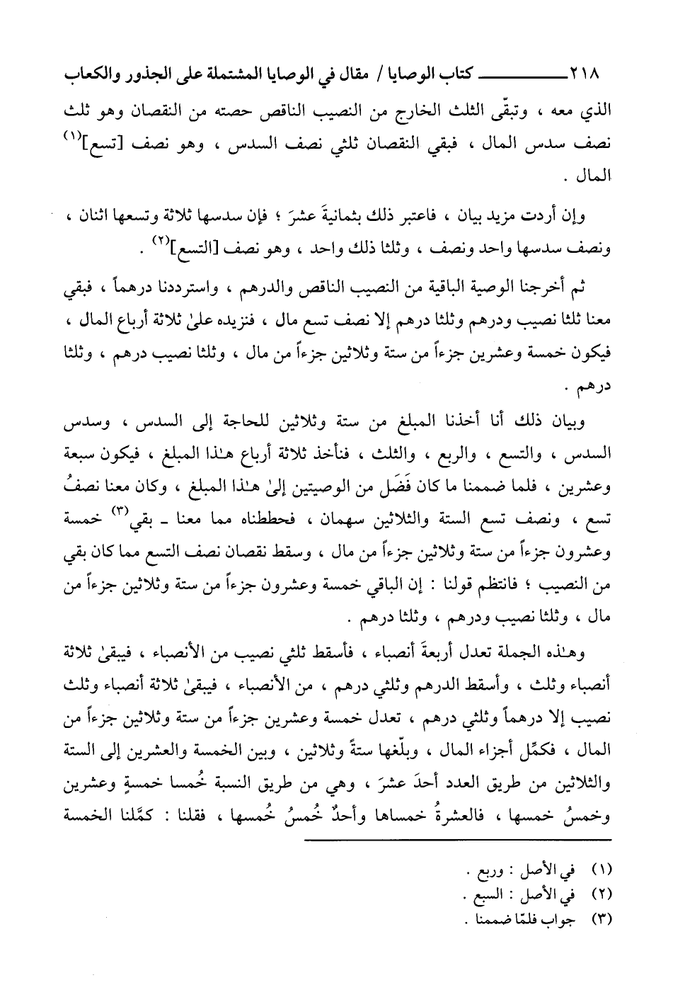 وبيان ذلك أنا أخذنا المبلغ من ستة وثلاثين للحاجة إلى السدس، وسدس السدس، والتسع، والربع، والثلث، فنأخذ ثلاثة أرباع هذا المبلغ، فيكون سبعة وعشرين، فلما ضممنا ما كان فَضَل من الوصيتين إلى هذا المبلغ، وكان معنا نصفُ تسع، ونصف تسع الستة والثلاثين سهمان، فحططناه مما معنا - بقي (3) خمسة وعشرون جزءاً من ستة وثلاثين جزءاً من مال، وسقط نقصان نصف التسع مما كان بقي من النصيب؛ فانتظم قولنا: إن الباقي خمسة وعشرون جزءاً من ستة وثلاثين جزءاً من مال، وثلثا نصيب ودرهم، وثلثا درهم.